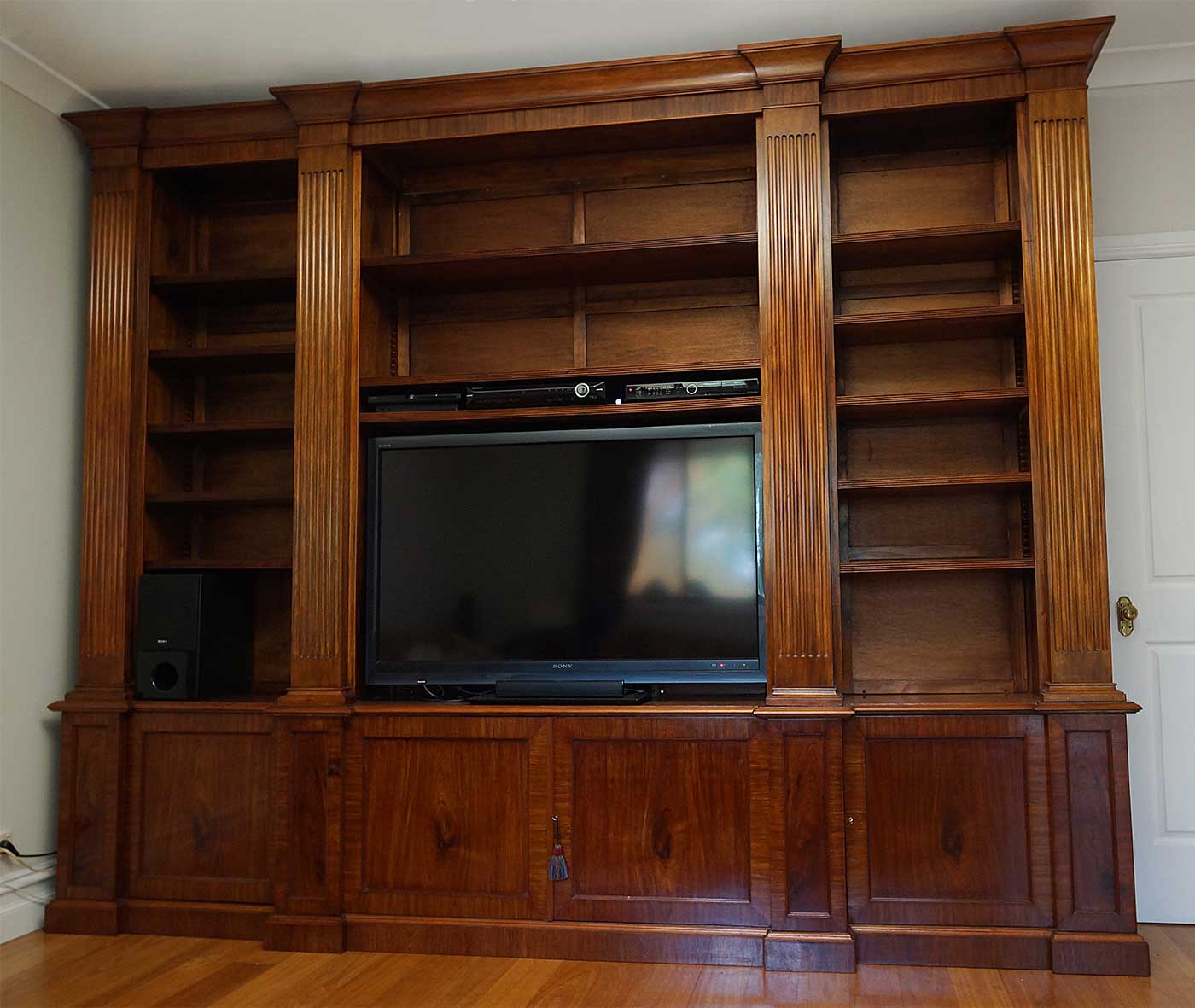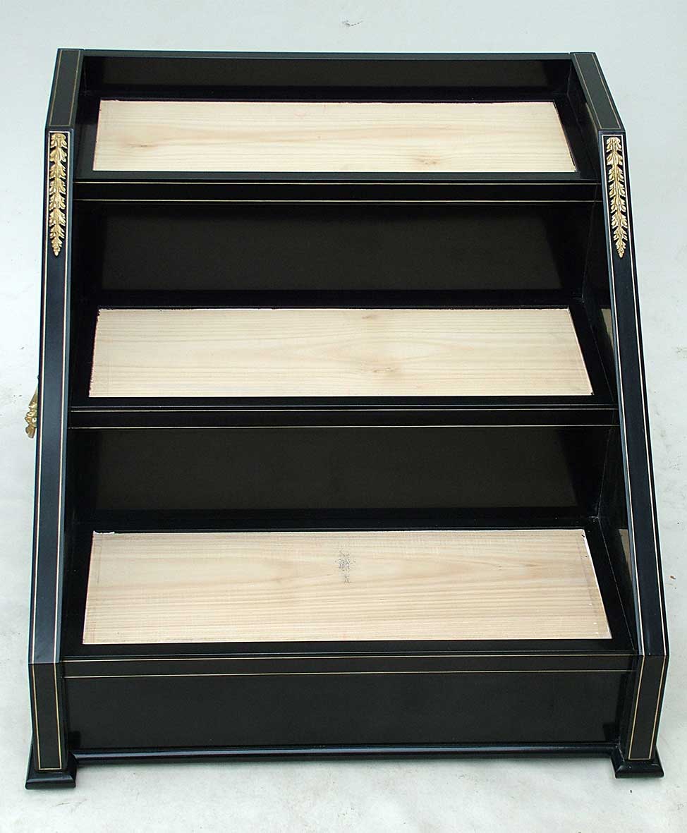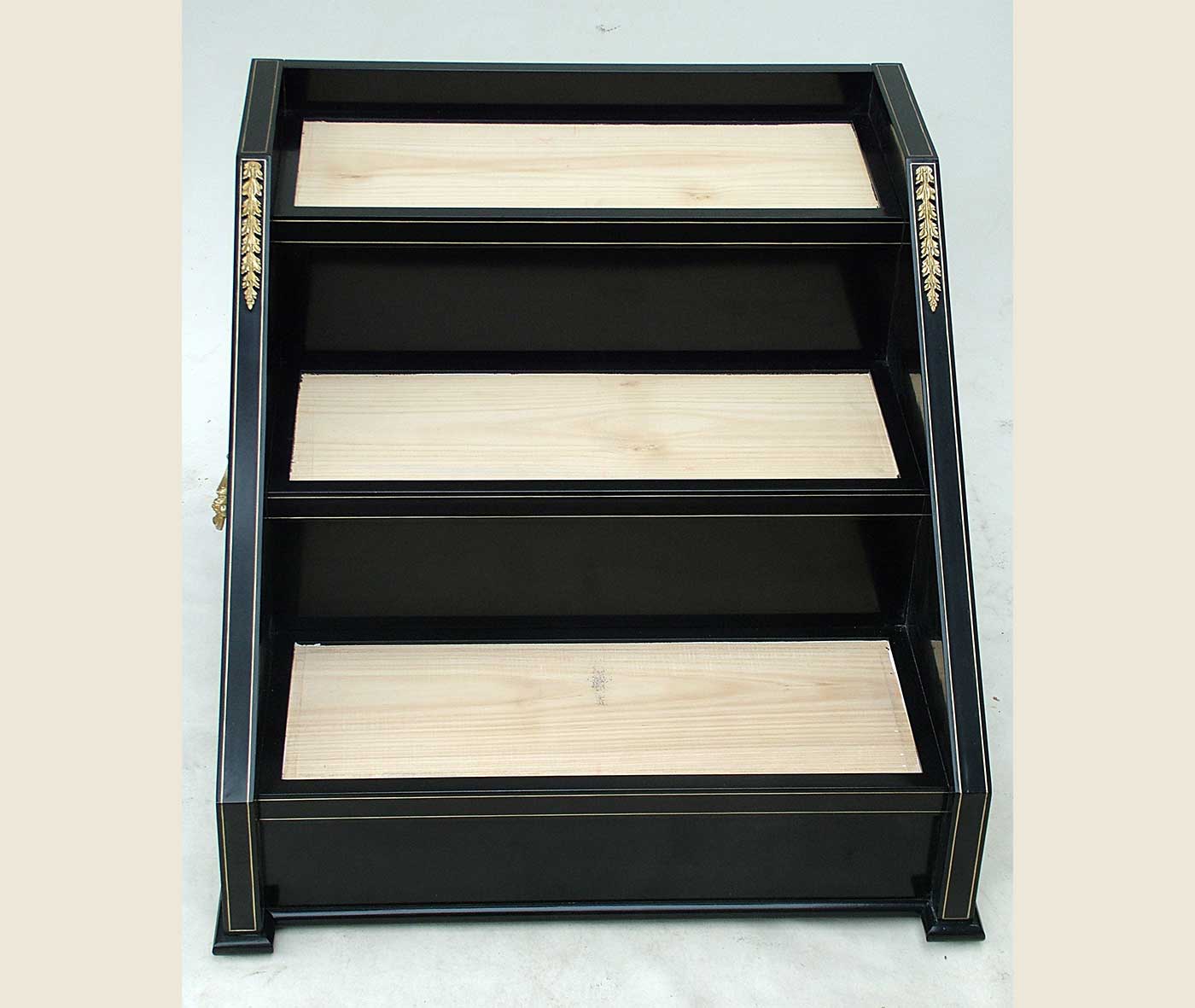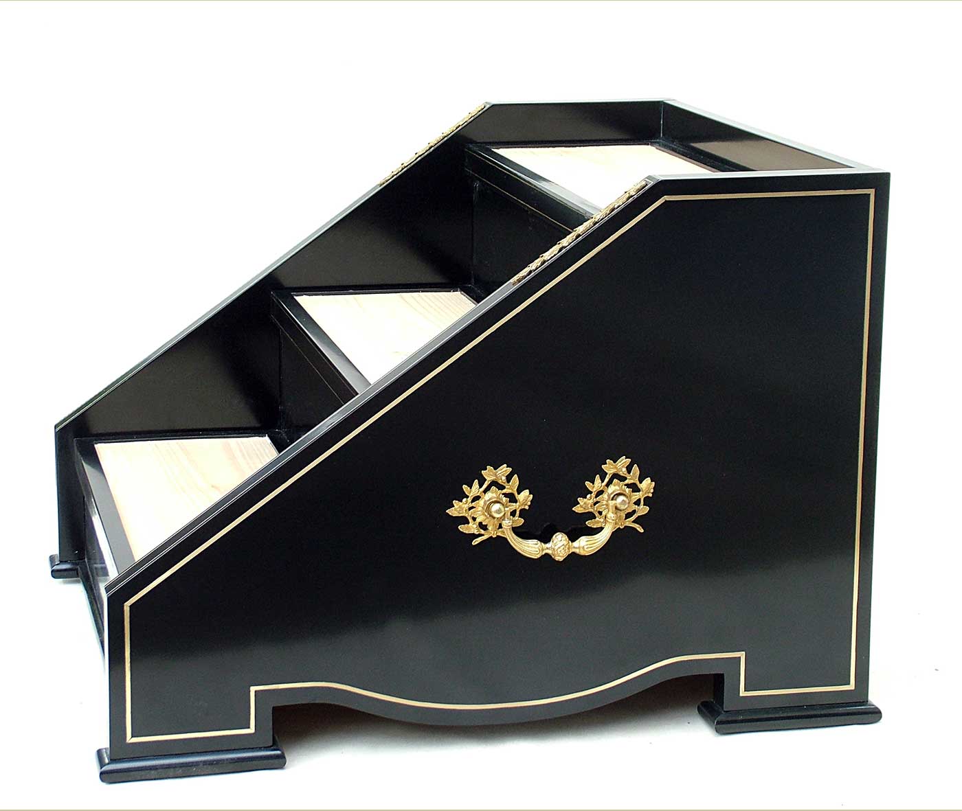 The photo shows the finished library steps from the side. There are brass line works inserted around the edges into a black lacquered background and a pair of reproduction brass handle was added for easy lifting.
