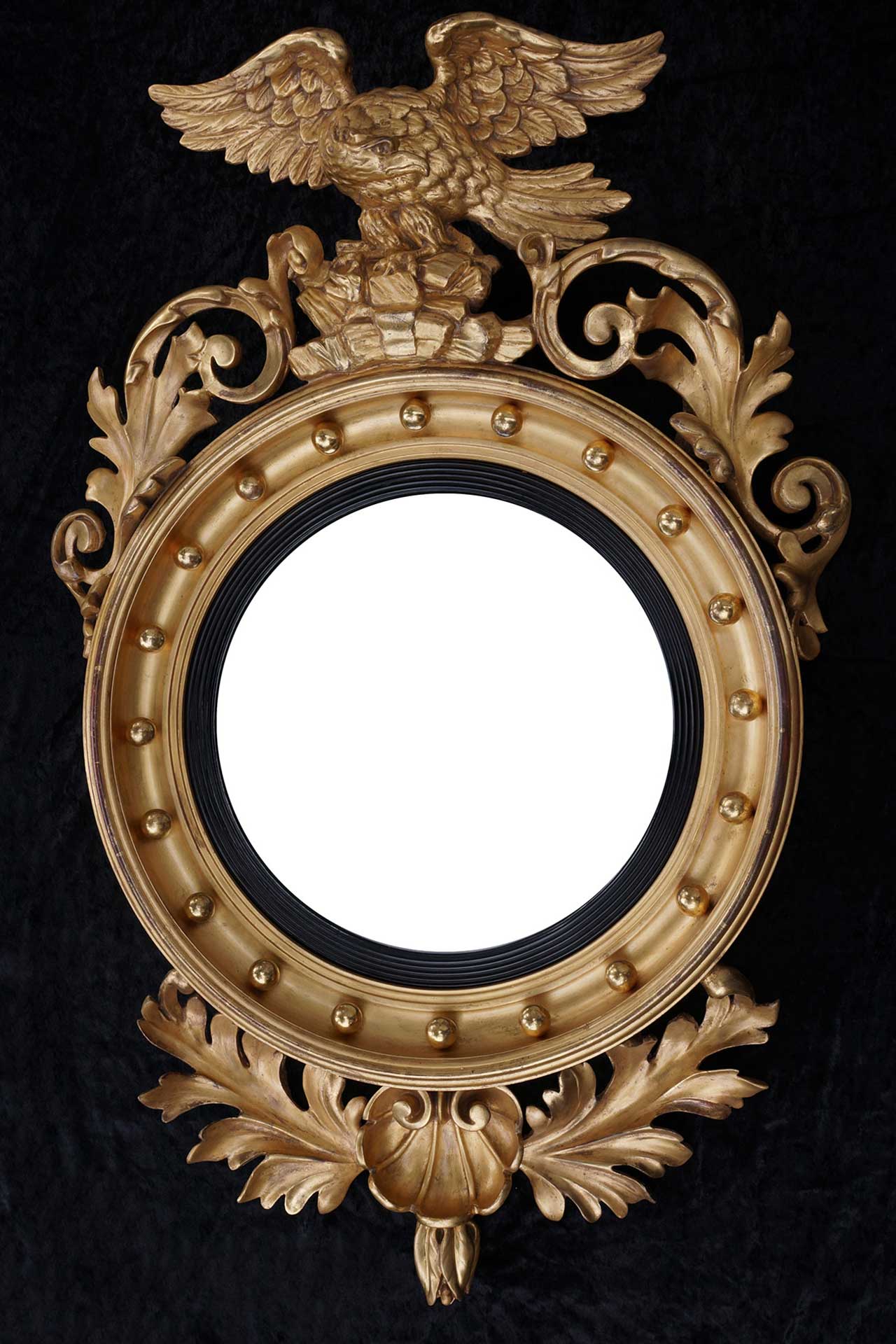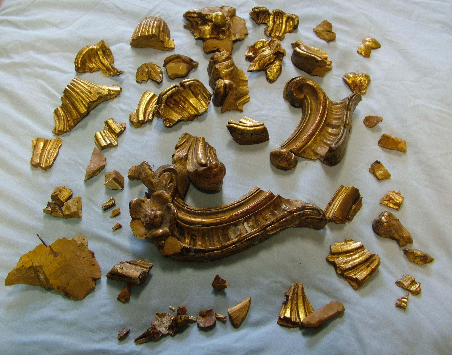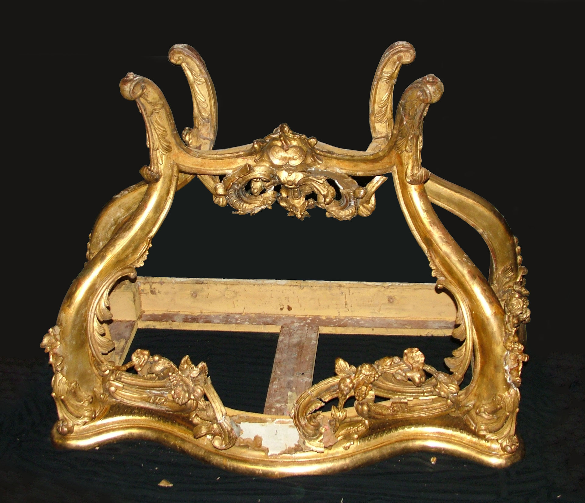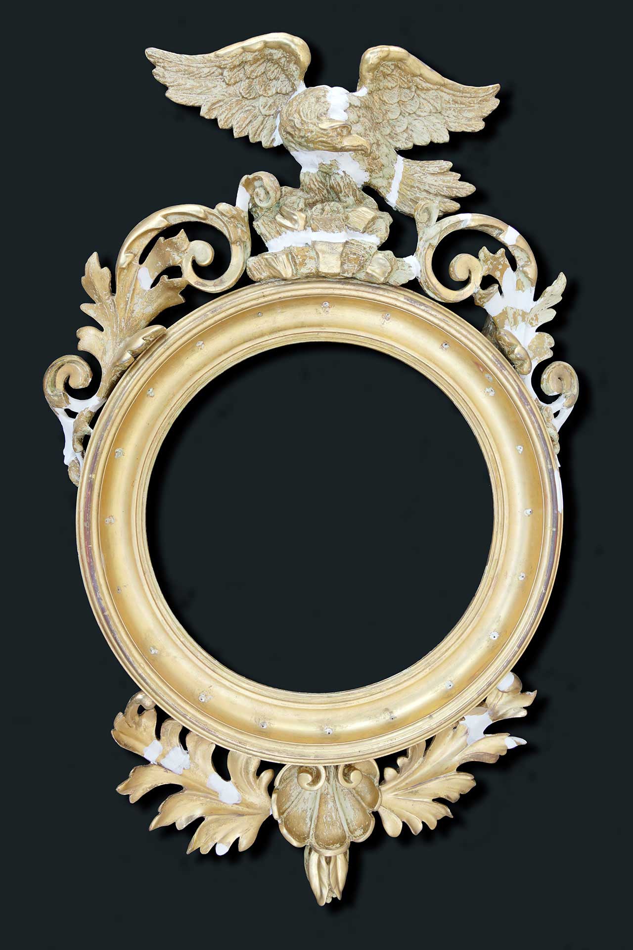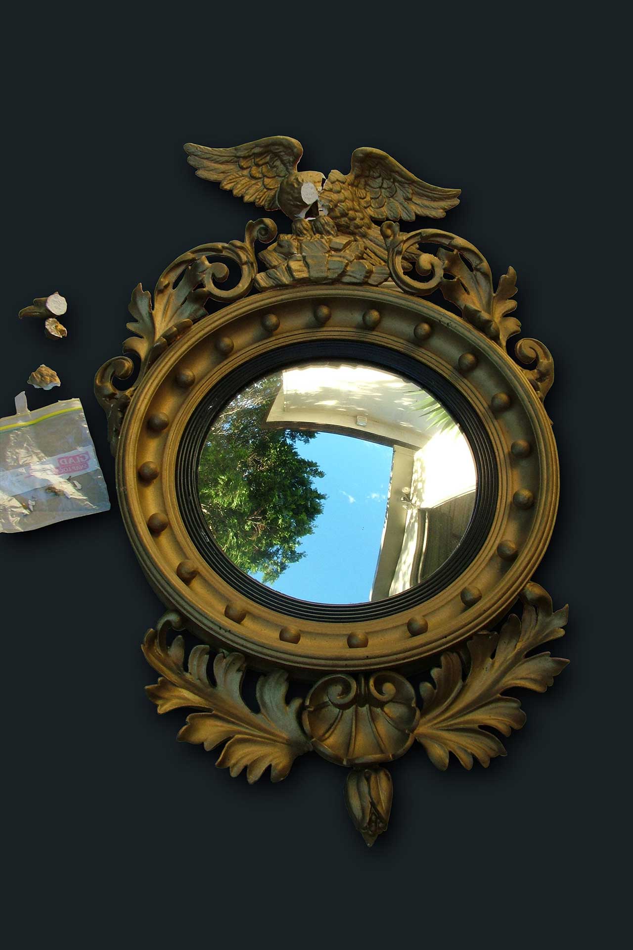 The entire mirror had been overpainted with gold paint that tarnished with time. The eagle’s head broken off and its body is damaged. A couple of the larger pieces are still available. There were hidden repairs underneath the paint.