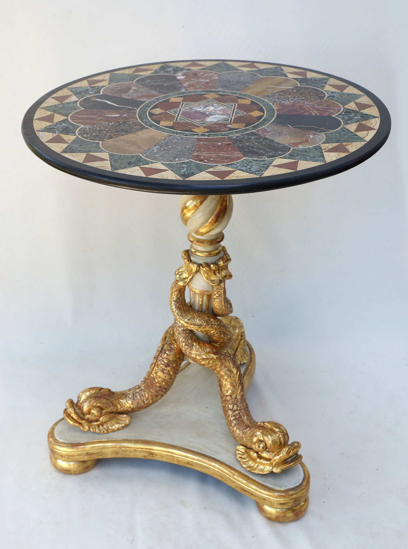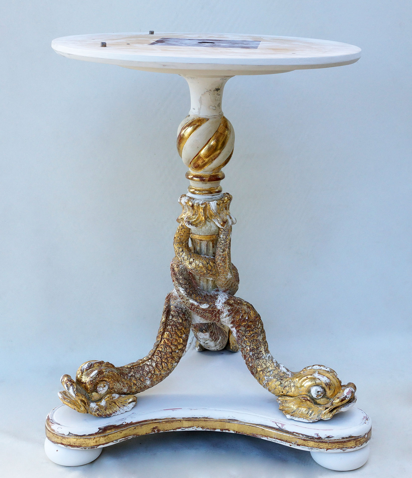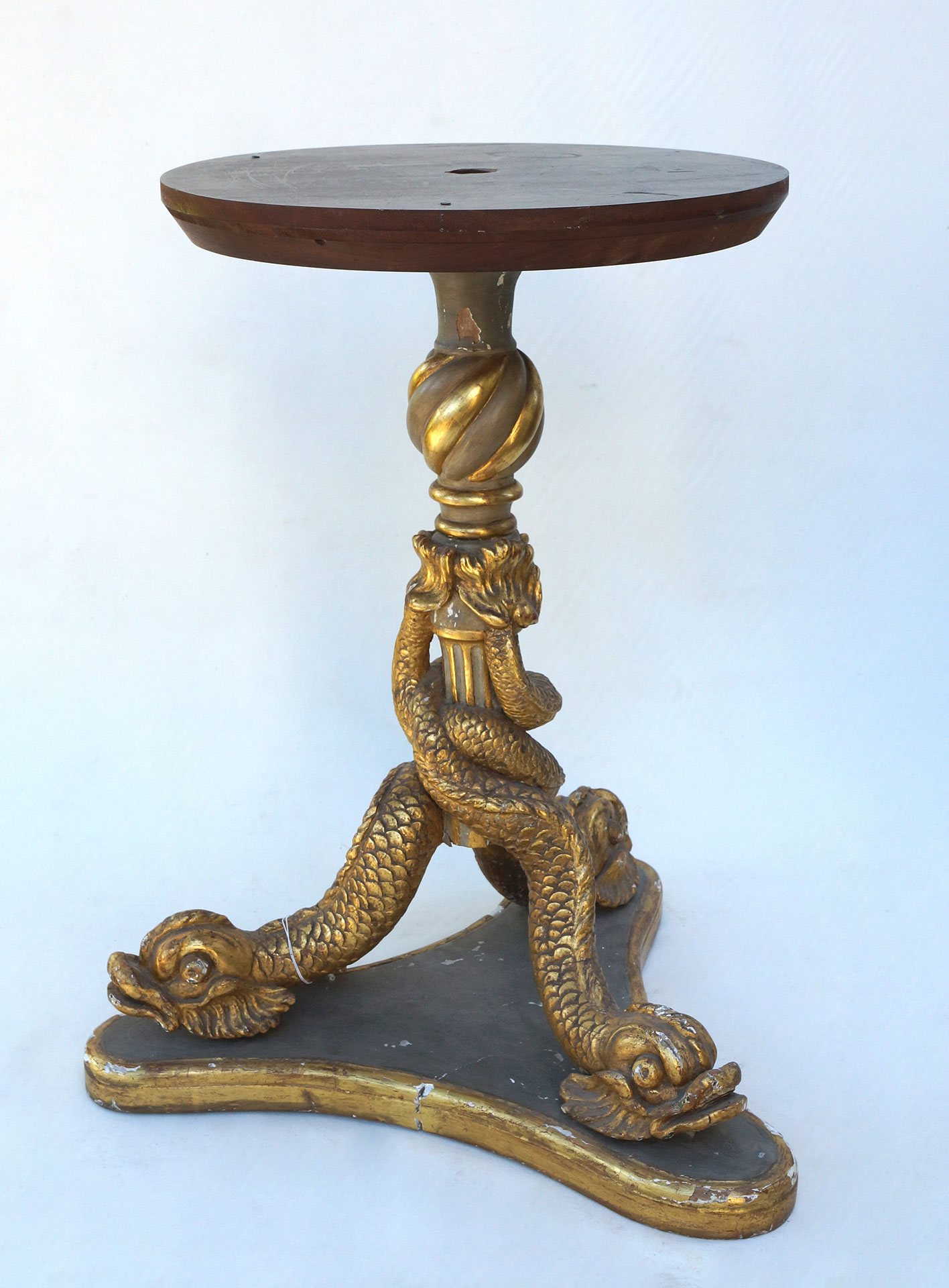 The gold paint had been stripped back to reveal the original water- gilding and oil- gilding in very good condition. The red colour is the colour of the original bole that is showing though the gold. Three bun feet had been turned and gesso-ed with the triangular base and smaller missing parts. Water and oil-gilding completed using 24 karat gold.