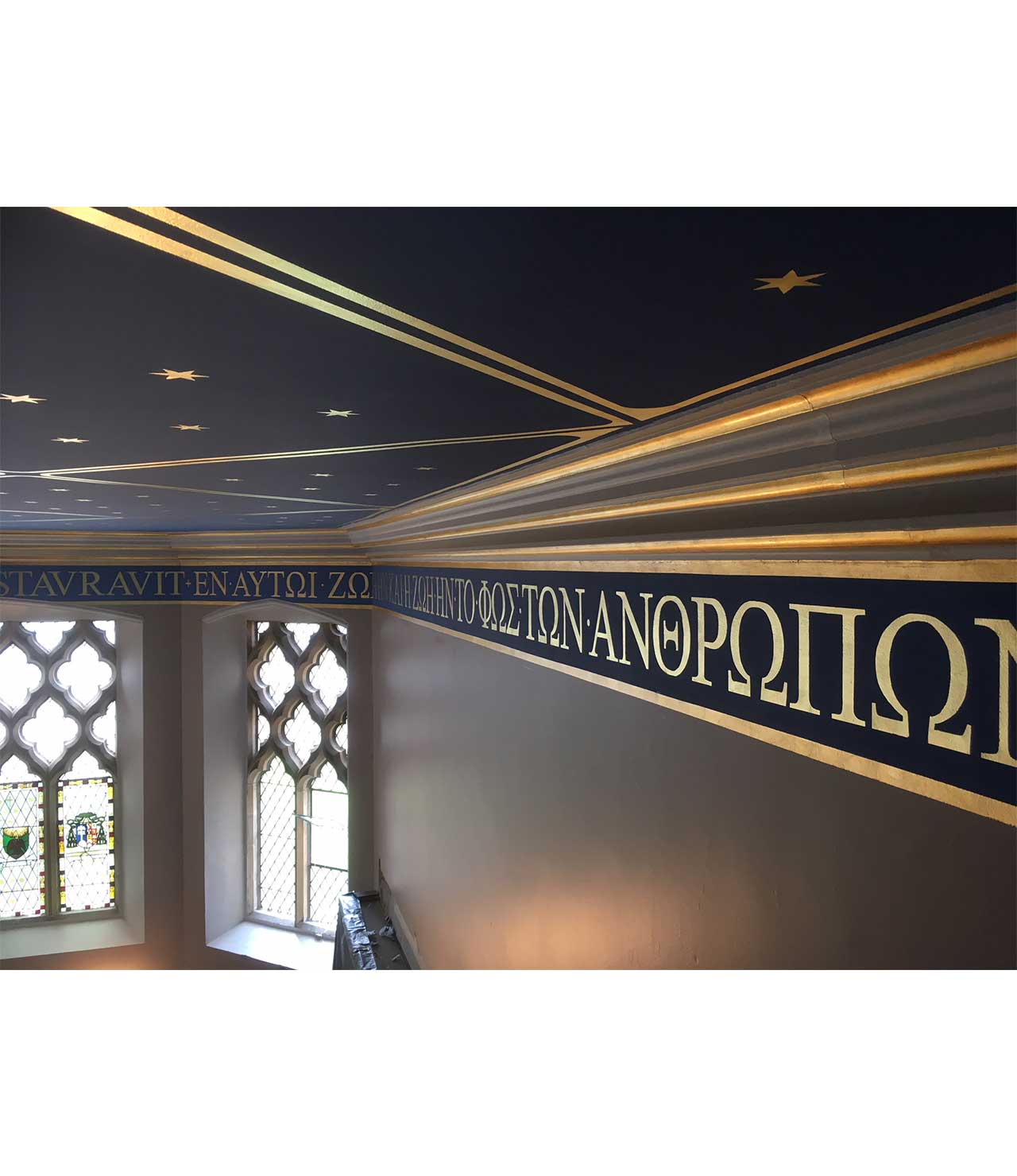 This photo shows the finished ceiling geometrical fields with the golden stars. It also shows the Latin and Greek quotations that decorates more...