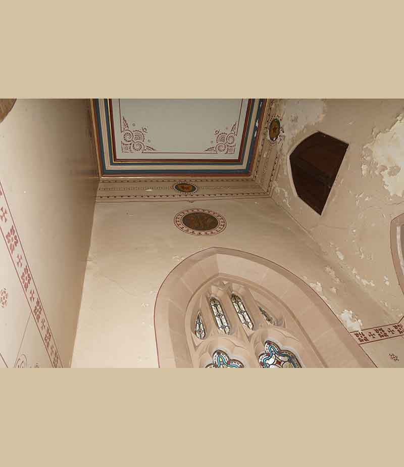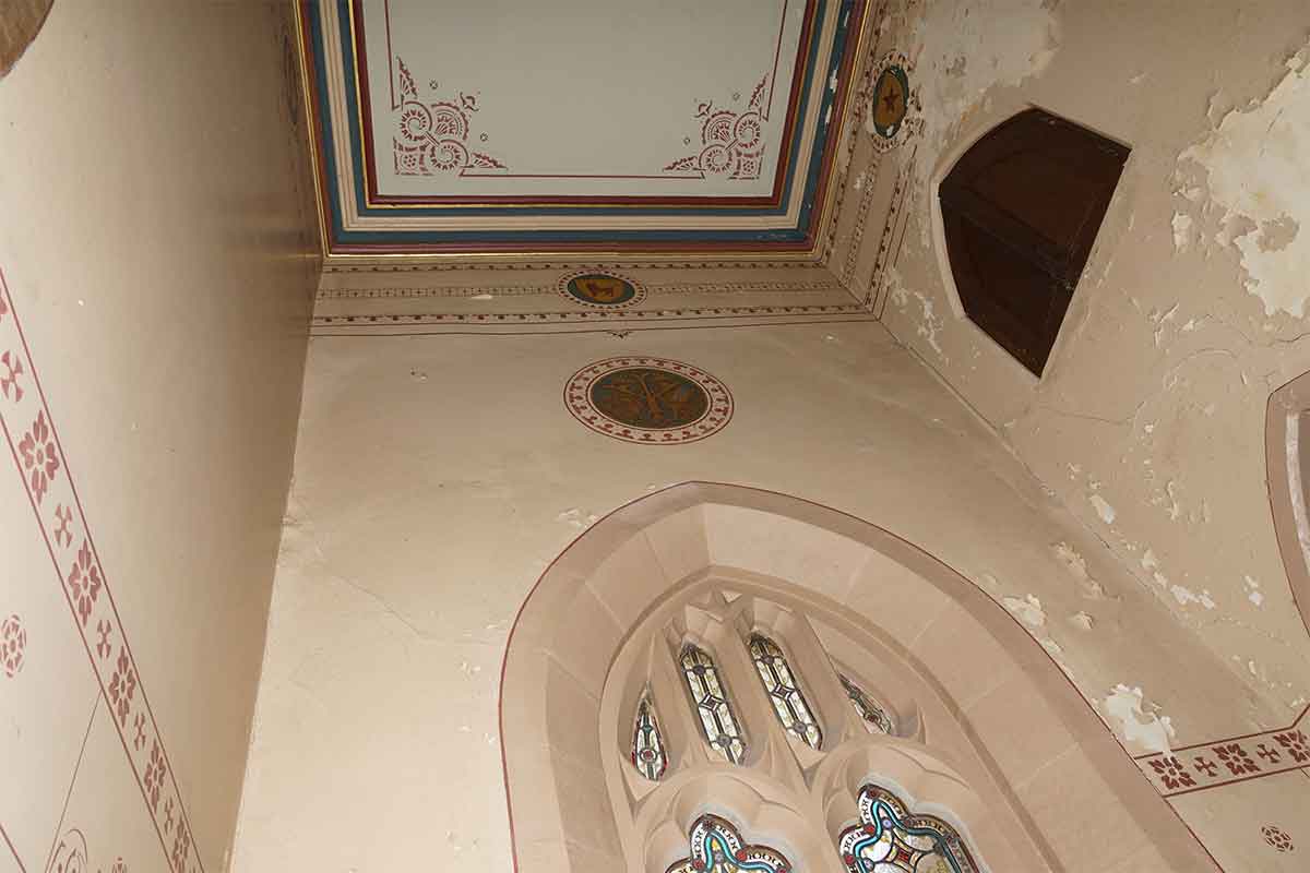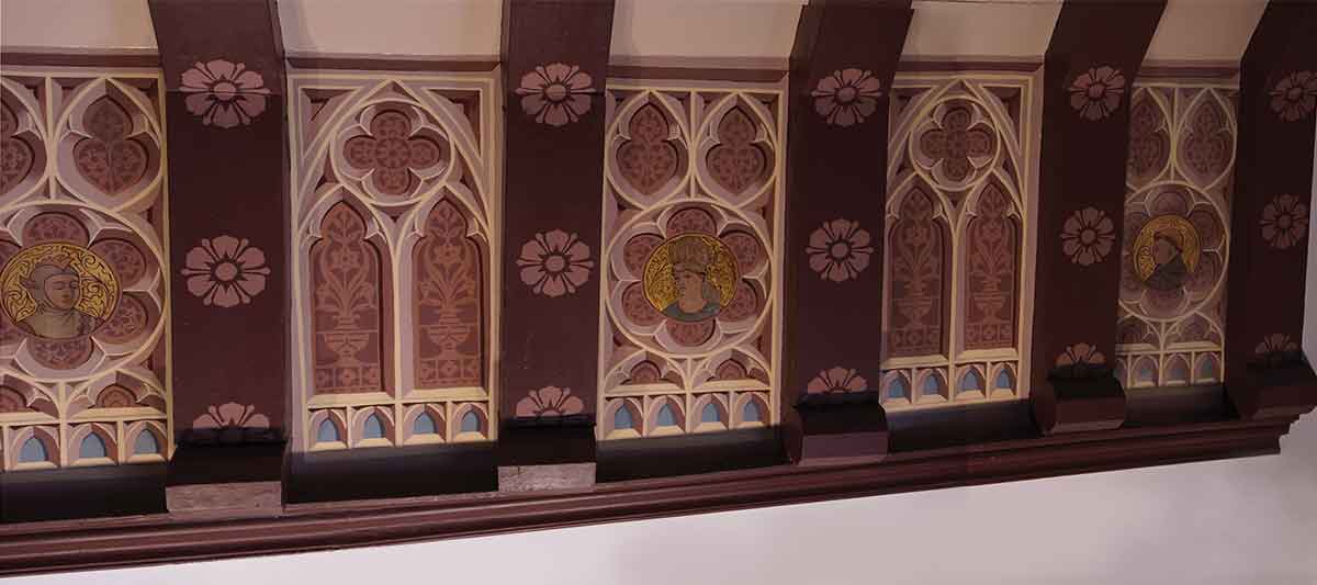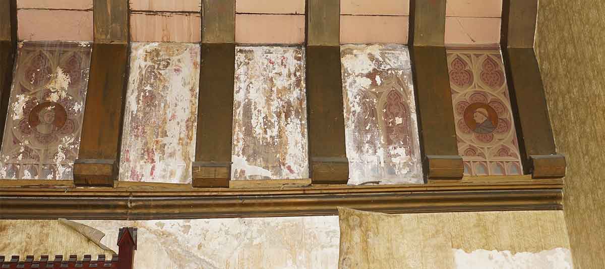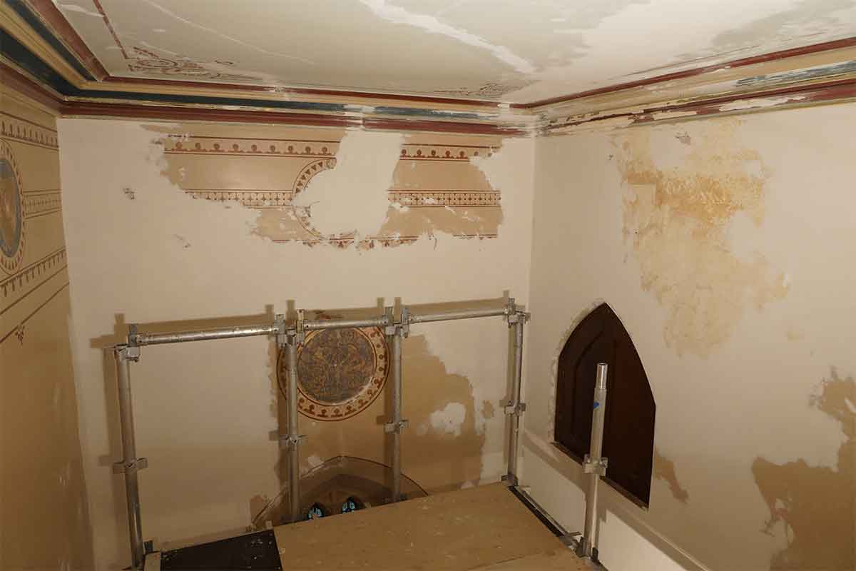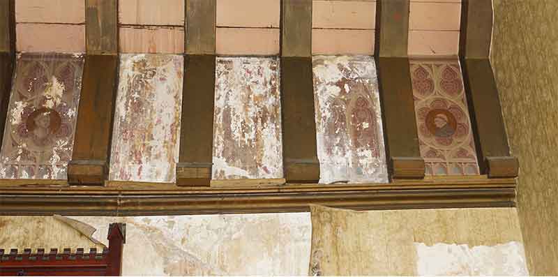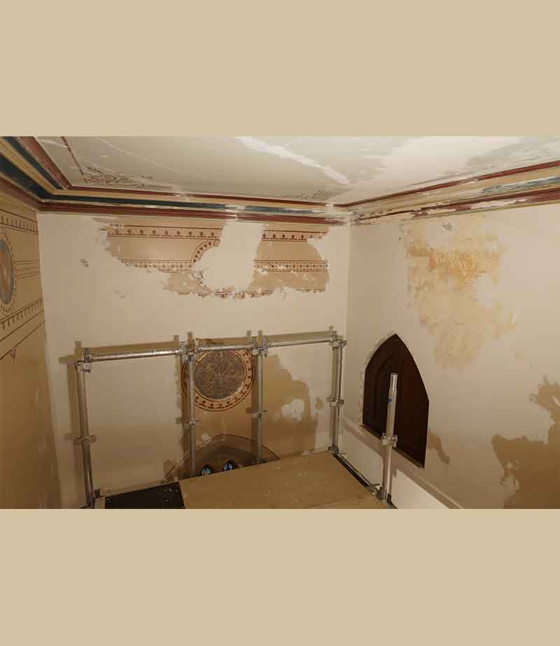 The timber beams were painted with gold paint. This was stripped back in places and we found the original rosette underneath. These rosettes were stencilled back after the restoration of the painted plaster murals was finished.
