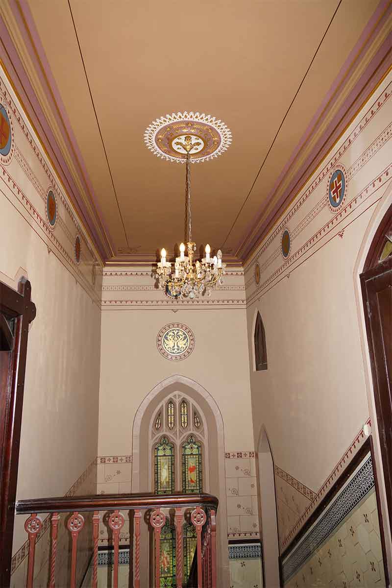 showing various coat of arms and the builder’s own coat of arm above the window was restored. Line work was painted on the ceiling and the central rosette for the chandelier restored to its formal glory. We had to cut several stencils for the various patterns that covered the top of the walls and the lower part of the staircase. All the gilding done on the cornices, central rosette and the coat of arms was done using 24 karat gold leaves that won’t tarnish.
