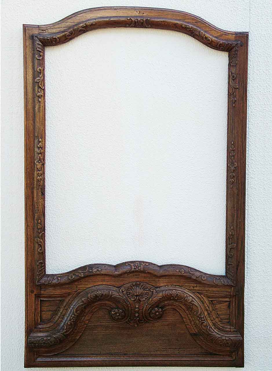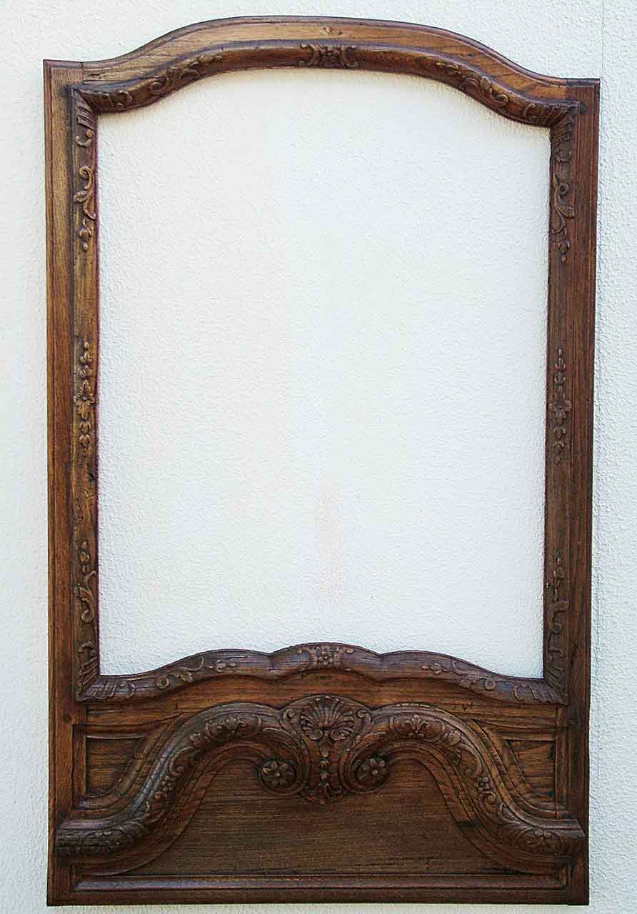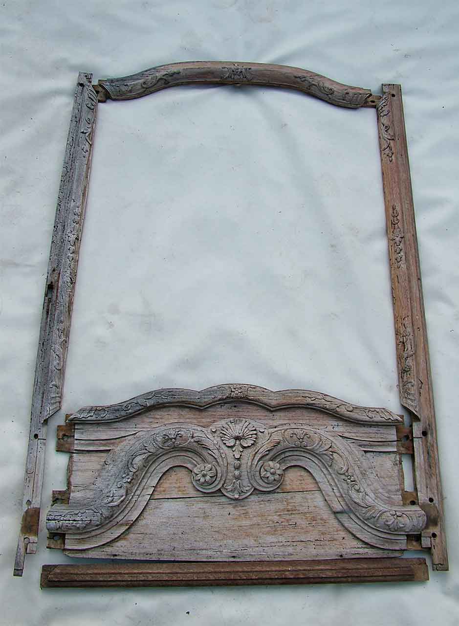 This is an image of a charming Belgian carved oak mirror frame that has been left outside for a while. It has deteriorated badly; lost all it’s protective varnish and the glue holding it together weakended and disintegrated so the frame has fallen apart. The sun’s UV rays faded the timber to near white on the exposed areas.