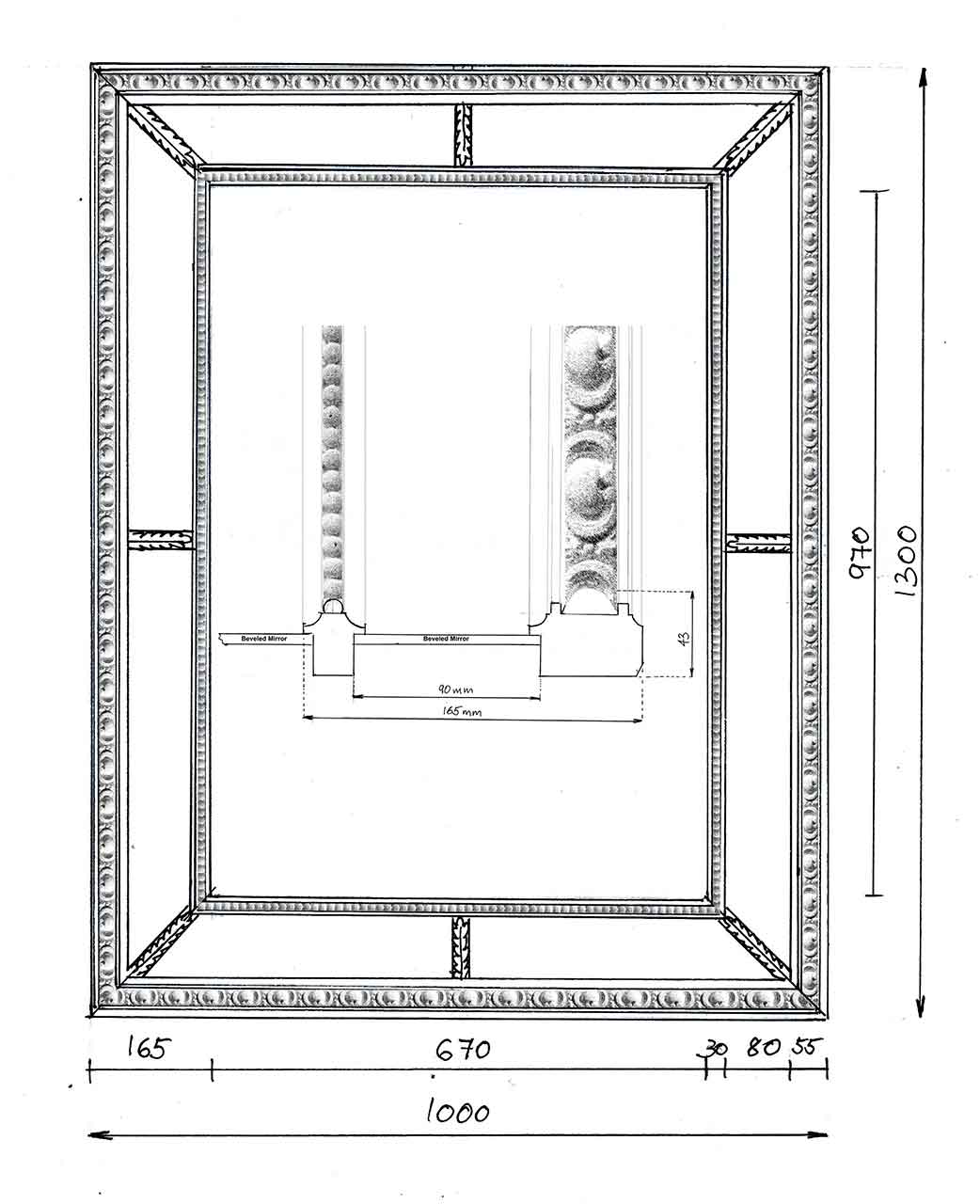 This is how all our new period frames begin: with the design. We draw up the image and enlarge the details of the mouldings that will be used with the measurements included. This design is a French cushion mirror frame where all the panels are mirrors. It’s very effective to capture the light in the room and create a stunning visual impact any time of the day.