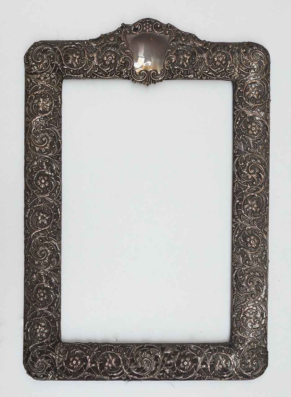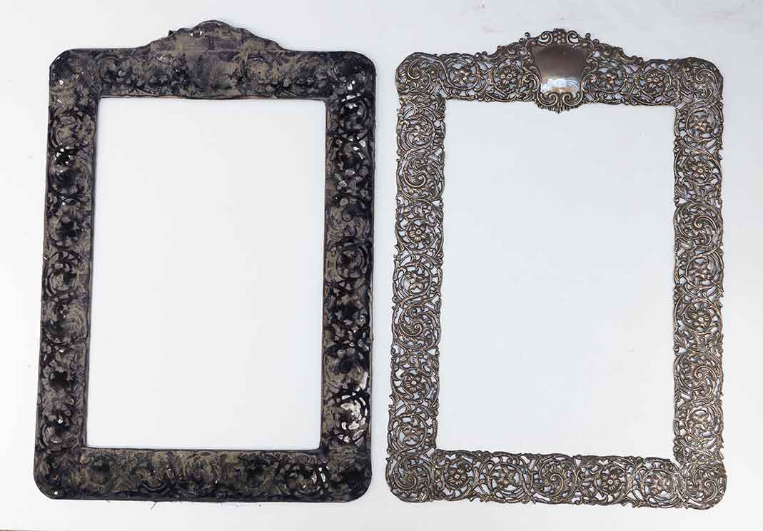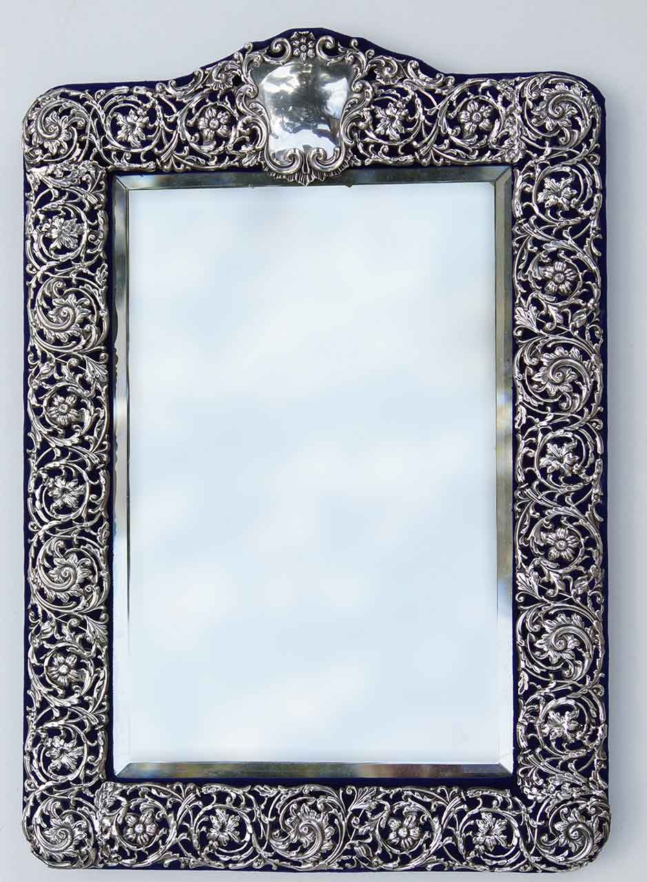 We have here an exceptionally large standing silver mirror frame. The silver repousse was dirty the crevices filled with black patina, dirt and dust. The beautiful dark blue velvet that suppose to create contrast has faded away and had been obscured by the accumulated residue from various silver cleaning products.
