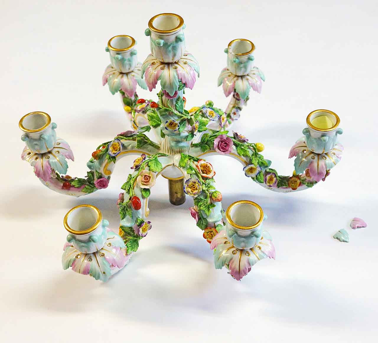 This image shows the restored candelabra with all seven arms assembled. This fine Meissen porcelain piece has beautiful pastel colouring and super fine modelling of all the flowers with extremely thin walls. We have restored the other piece of the pair as well and they’re now returned to Government House and could be seen on the mantel piece in the grand drawing room.